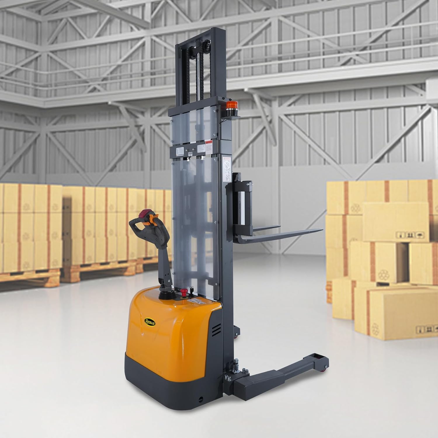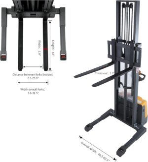 Convenient and Compact: Built-in charger for easy charging; compact Electric Stacker design with adjustable straddle legs and a minimum turning radius of 52.9″ for efficient operation in tight spaces