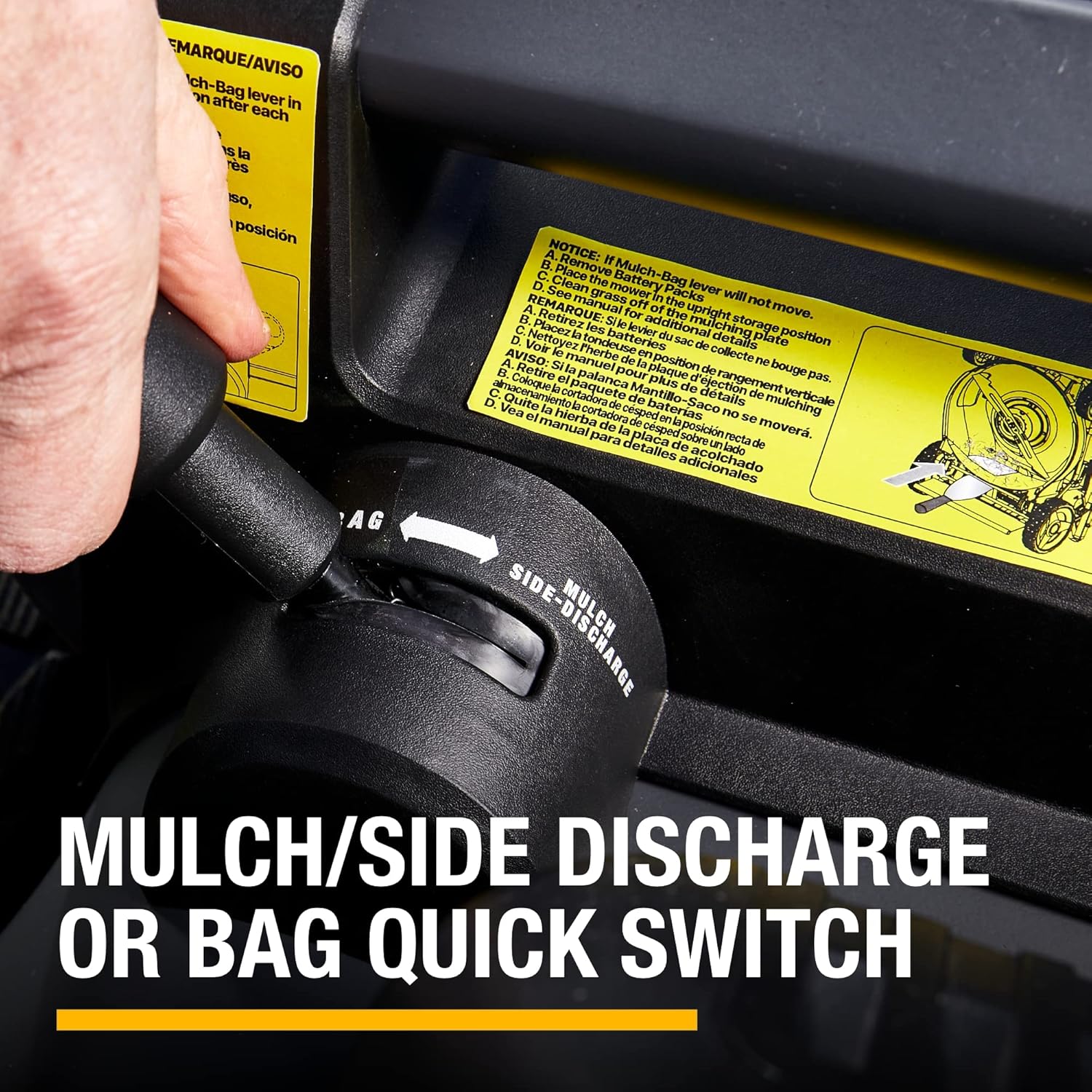 - mulch to bag, conversion by sliding the lever instead a plastic plug is so refreshing. There is no issue of loosing or forgetting to place the plug.