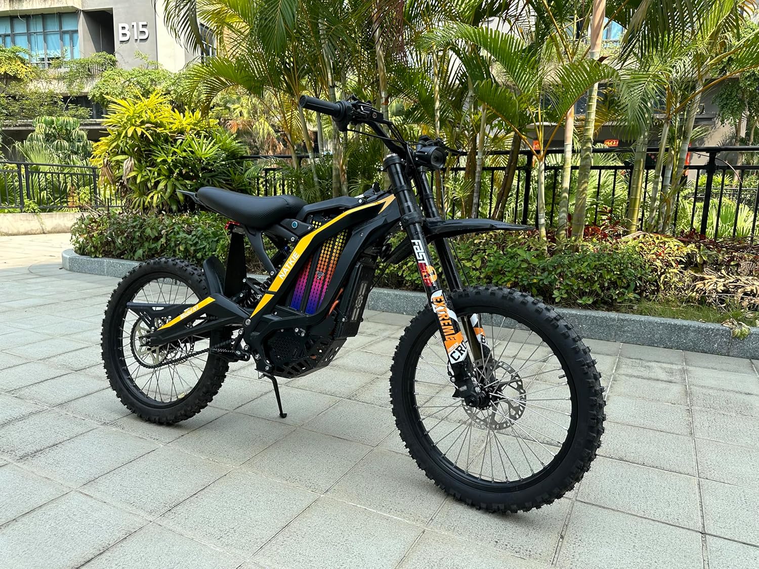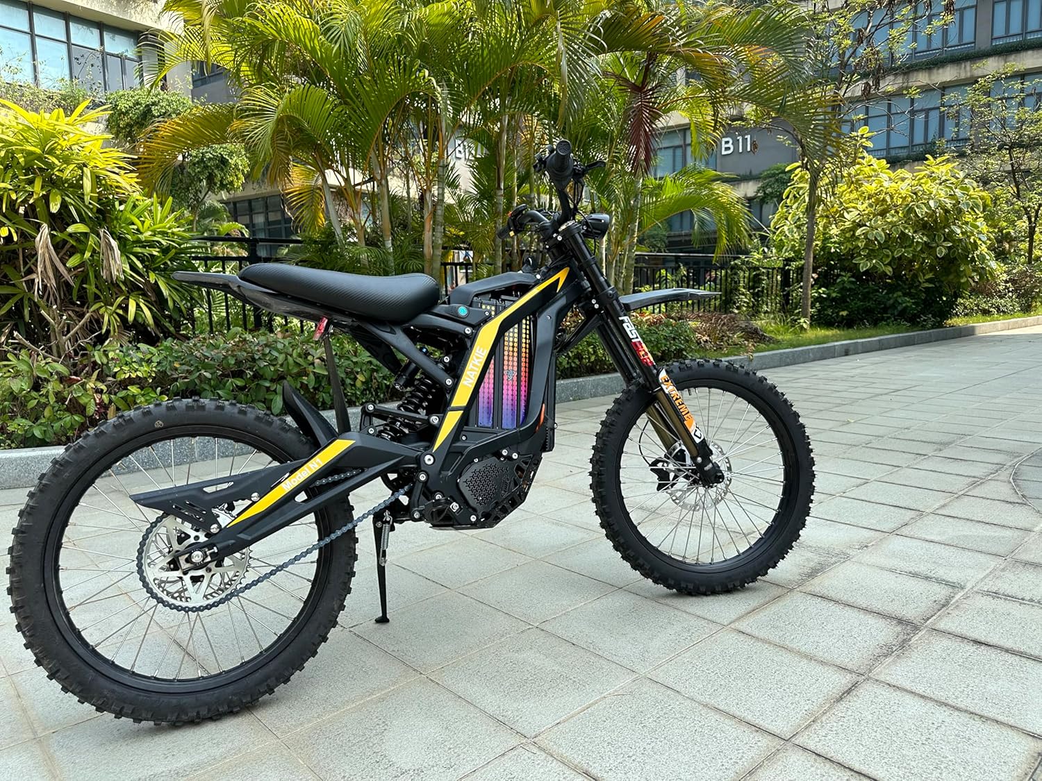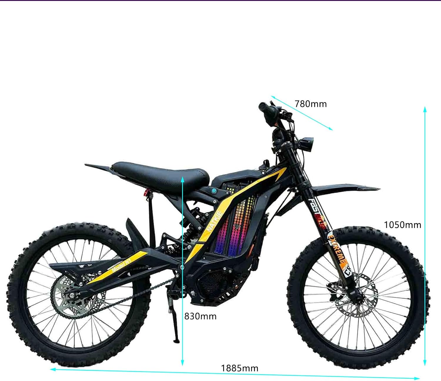 | Additional Features | MNT Suspension,Dual LED Headlight, Motor Power 4000W(Nominal), 8000W(Peak), Mid-mounted motor, Max Speed,Eco Mode: 35MPH; Sports Mode: 50MPH, Battery 72V, 30AH(2160Wh) |