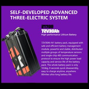 - Long-lasting Battery Performance Ride farther with confidence, thanks to the advanced LG INR21700 M50LT battery integrated into the Natkie. With a powerful 72V 30Ah (2160Wh) capacity, this battery provides an impressive range of 30-60 miles, ensuring you’re always ready for your next adventure. The battery’s state-of-the-art technology and durability make it ideal for long-distance travel, while its high efficiency guarantees a seamless and enjoyable riding experience.