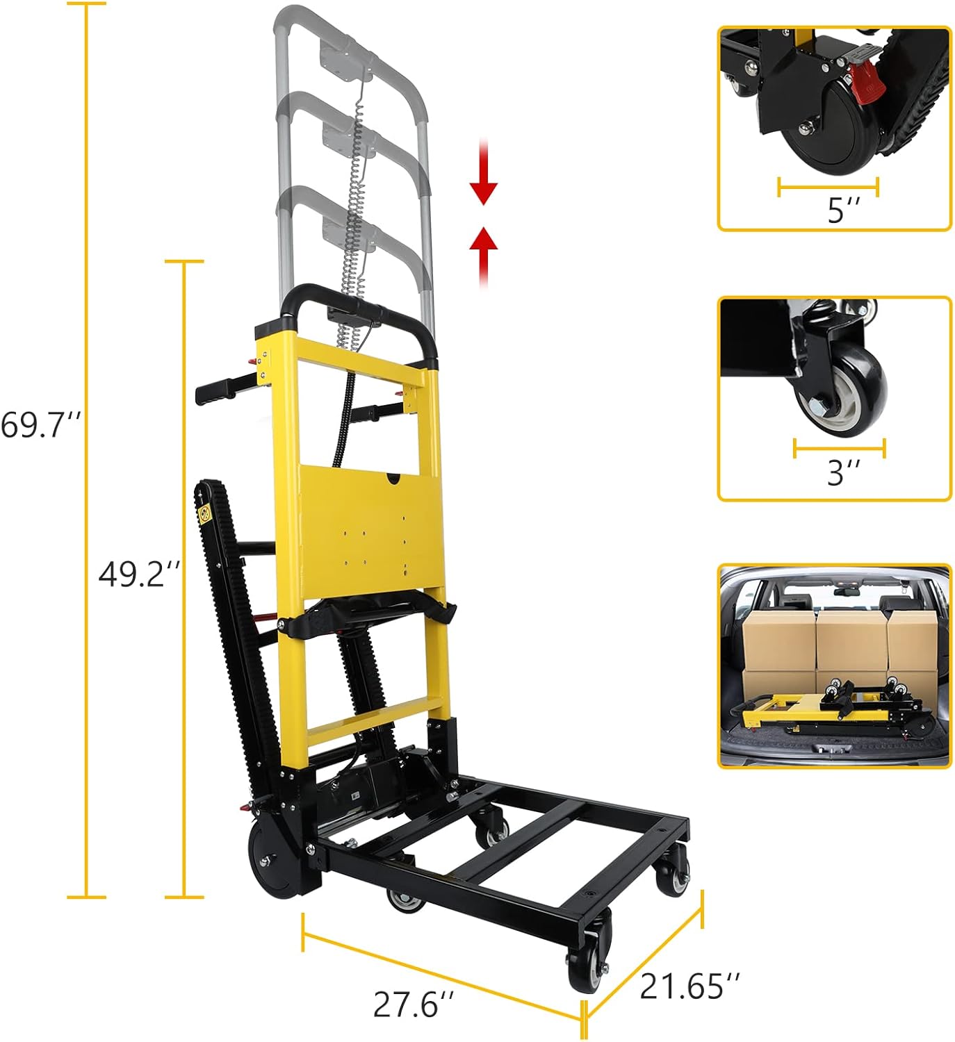 200W Brushless MOTOR: 440 lbs Max load limit and 24V/13.6Ah Battery, electric hand trucks dolly can climb 120 floors/1500 steps after about 4 hours of charging. Adjustable seat belt provides storage up to 27.6″L x 21.7″W x 69.7″H