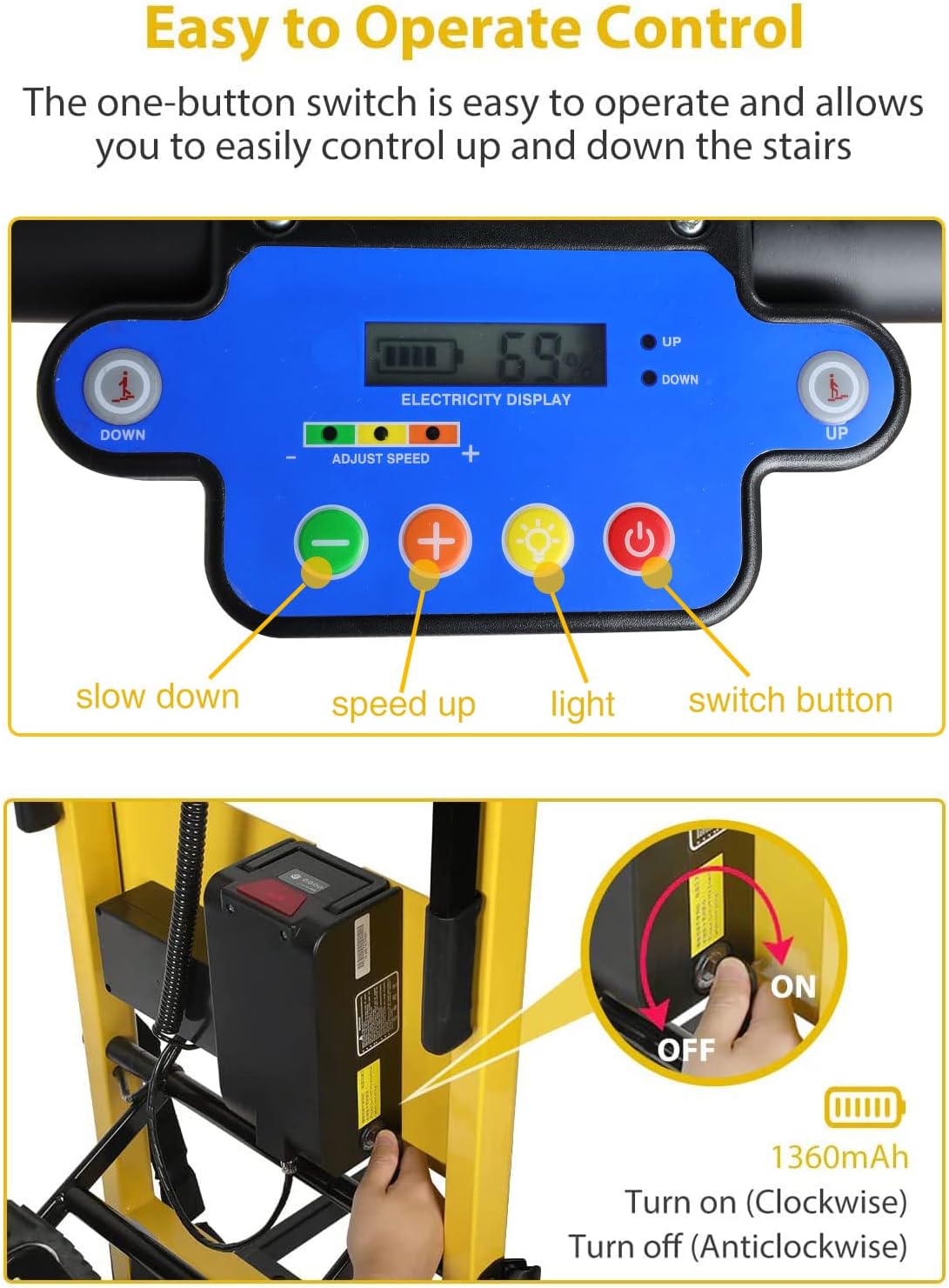 UPGRADED LCD DISPLAY: Riosoc electric climbing dolly with slow down, speed up, light, and switch button 4 functions, three adjustable gears speeds of 1.1s, 1.2s,1.3s a step, you don’t worry about working in dim or dark environments