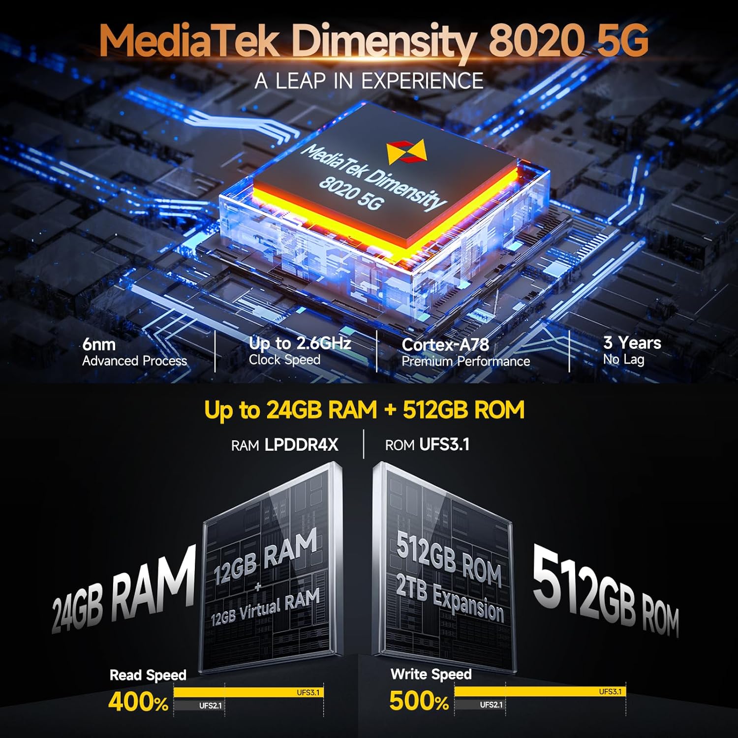 【MTK Dimensity 8020 5G & 24GB + 512GB】2.6GHz high-frequency Arm Cortex-A78 8-core CPU comes with powerful Arm Mali-G77 GPU with a leading 6nm process. 12GB RAM (up to 12GB of virtual RAM) allows multiple memory-hungry apps to run snappily at the same time. 512GB of internal storage as well as TF card expansion supported 2TB.